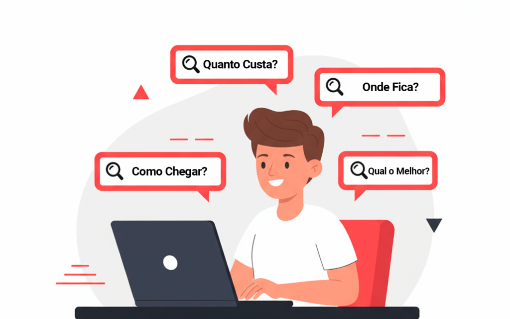 O Google funciona assim: alguém digita uma pergunta ou necessidade, e o Google mostra os melhores resultados. Para o seu negócio aparecer, o texto do seu site precisa conter as mesmas palavras que o seu cliente usa quando pesquisa.